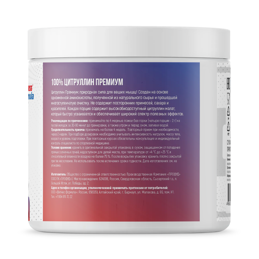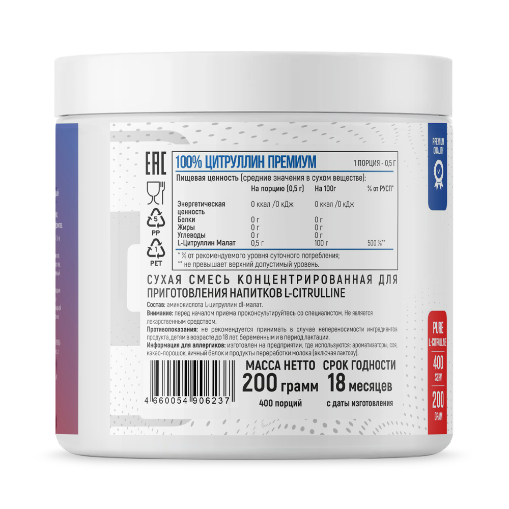 Цитруллин Премиум: природная сила для ваших мышц! Создан на основе одноименной аминокислоты, полученной из натурального сырья и прошедшей многоступенчатую очистку. Не содержит посторонних примесей, сахара и красителей. Каждая порция содержит высокобиодоступный цитруплин малат, который быстро усваивается и обеспечивает широкий спектр полезных эффектов.
