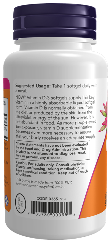 Витамин D-3 в капсулах содержит этот ключевой витамин в форме хорошо рассасывающихся жидких капсул. Витамин D обычно поступает с пищей или вырабатывается кожей под воздействием ультрафиолетовой энергии солнца. Тем не менее, его не так много в продуктах питания. По мере того, как все больше людей избегают пребывания на солнце, добавки витамина D становятся еще более необходимыми для обеспечения достаточного питания вашего организма.
